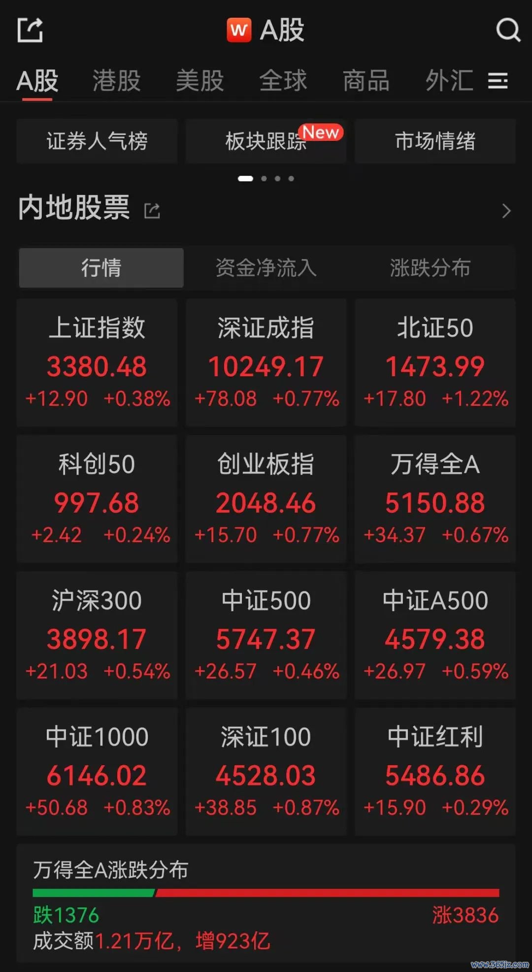 截至收盘,沪指报3380.48点,涨0.38%;深成指报10249.17点,涨0.77%;创指报2048.46点,涨0.77%。