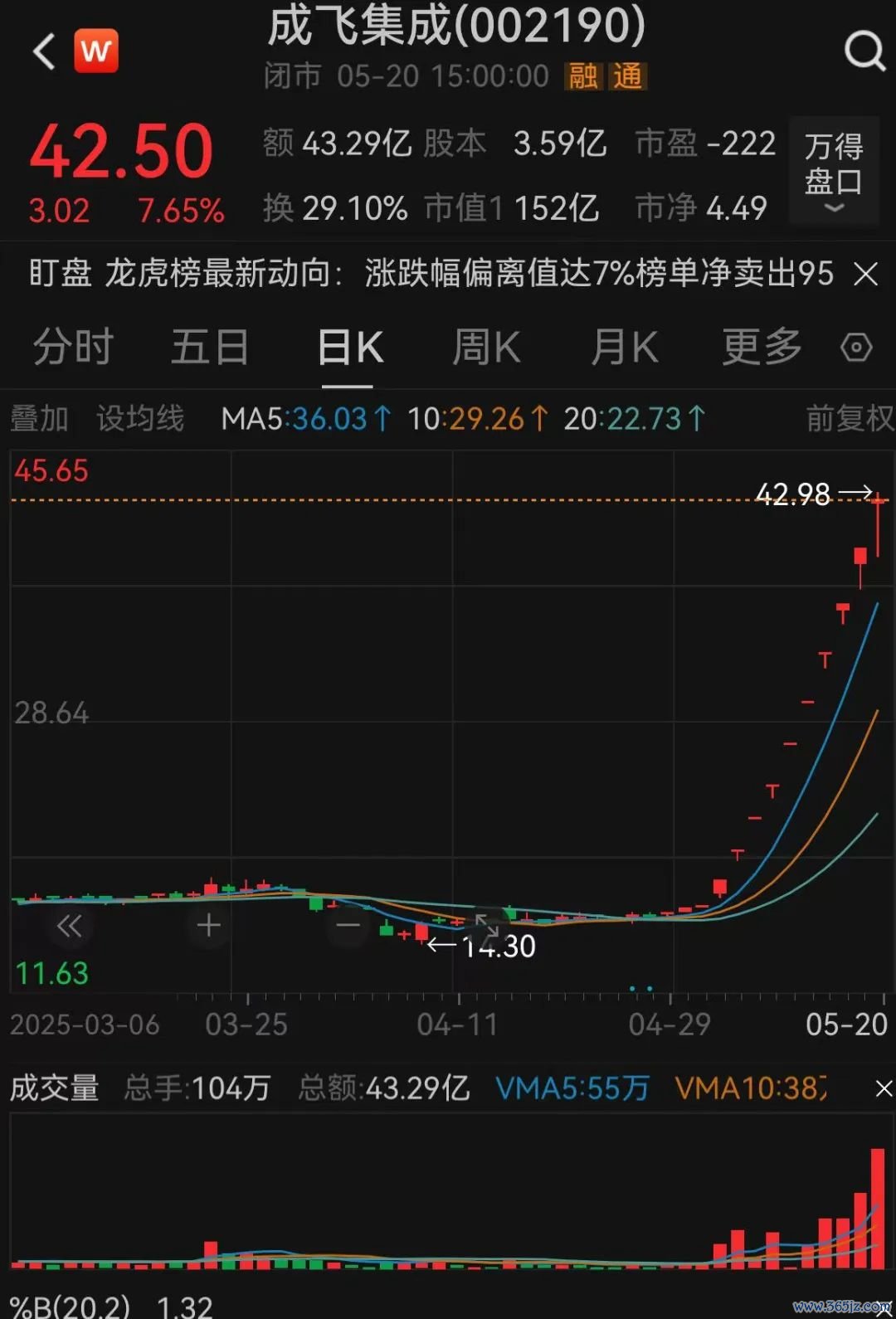 5月20日,成飞集成(002190)并未迎来第10个涨停板,出现“断板”,但是收盘依然大涨7.65%。自5月7日以来累计涨幅达到153.88%免费配资炒股网站,跻身同期A股公司涨幅榜首位。